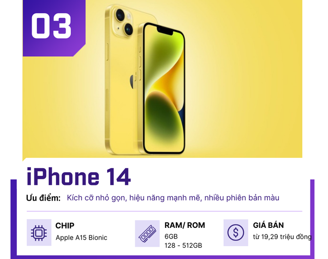 Sức giảm giá của iPhone 14 quá mạnh đến mức chúng hạ xuống tầm giá dưới 20 triệu đồng - không cách biệt quá nhiều với iPhone 13. Lợi thế lớn hơn của chiếc iPhone này so với bản tiền nhiệm là có thêm 1 năm cập nhật phần mềm, hiệu suất được tăng cường và tính năng thông báo SOS khẩn cấp qua kết nối vệ tinh.