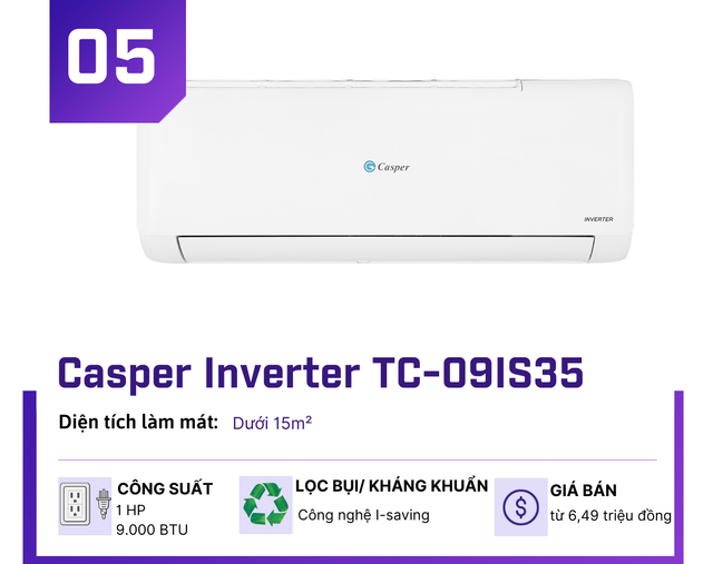 Gợi ý cuối cùng trong danh sách này là điều hoà Casper Inverter 1 HP TC-09IS35. Mức giá này khá dễ chịu với nhiều gia đình. Máy cũng có khả năng tiết kiệm điện nhờ công nghệ tiết kiệm I Saving.
