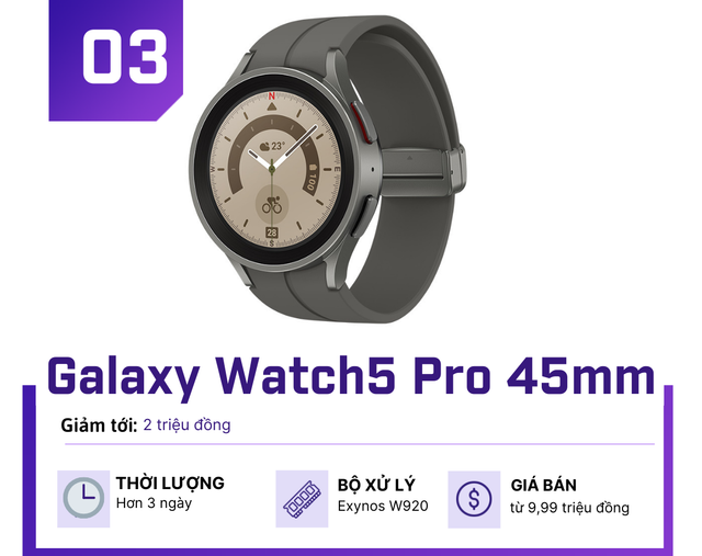 Là mẫu đồng hồ thông minh cao cấp nhất hiện có của Samsung, Galaxy Watch 5 Pro 45mm cũng đang được giảm giá lên tới 16%, là thời điểm tốt để Samfan "lên đời" smartwatch. Khác với phiên bản Galaxy Watch thông thường, đồng hồ có độ bền xịn sò hơn với chuẩn quân sự MIL-STD-810H, trang bị kính cường lực, chống va đập và chống nước 5ATM tốt hơn.