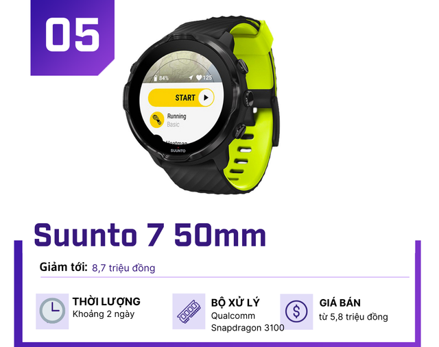 Hiện tại, đồng hồ Suunto 7 50mm có mức giảm "khủng" nhất trong phân khúc smartwatch. Điểm đặc biệt hơn nữa là sản phẩm thuộc dòng đồng hồ thể thao, có khả năng chống chịu thời tiết khắc nghiệt tốt hơn nhiều "đối thủ" cùng tầm giá.