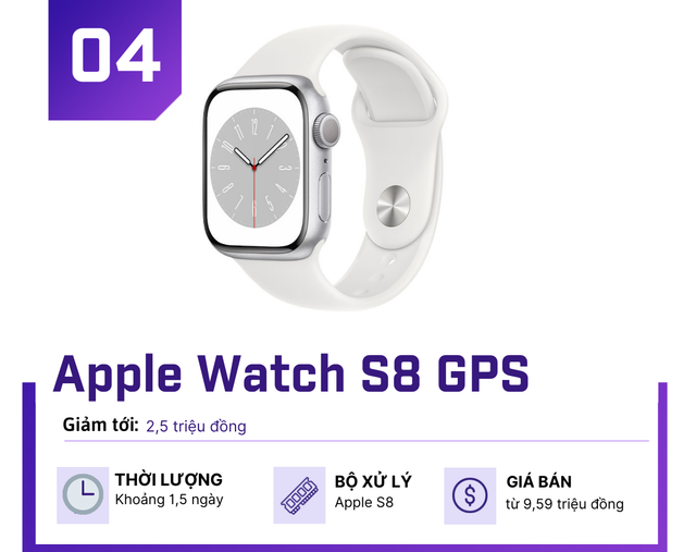 Mức giá sau giảm của Apple Watch S8 GPS thấp tới mức khó tin. Sở hữu mẫu đồng hồ thông minh mới nhất của "Nhà Táo", người dùng sẽ được trải nghiệm các tính năng hiện đại nhất của hãng: Phát hiện va chạm, Theo dõi nhịp tim, Đo lượng đường trong máu,... Đồng thời, sức mạnh xử lý từ chip Apple S8 cũng giúp sản phẩm dùng tốt trong khoảng 4 năm tới.