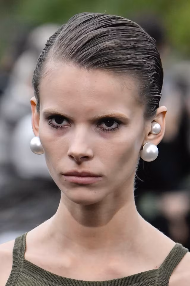 Mặc dù kiểu tóc pixie của rocker đã phổ biến trong các mùa trước, nhưng rõ ràng Xuân/Hè 2023 hướng đến "vẻ ngoài sạch sẽ". Để có được kiểu tóc đơn giản hơn này, bạn chỉ cần rẽ tóc sang một bên và vuốt gel.