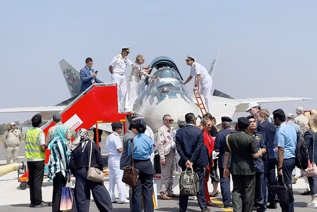 Các quan chức Ấn Độ tham quan Su-57 tại triển lãm Aero India 2025.