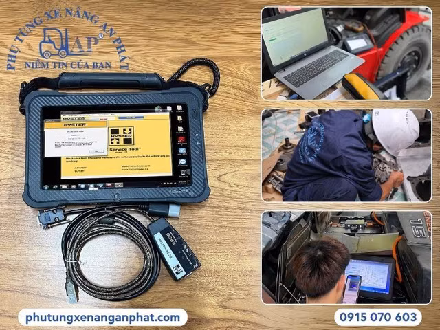 An Phát sửa chữa xe nâng điện bằng thiết bị chẩn đoán, để nhanh chóng phát hiện triệu chứng hư hỏng như cảm biến, bo mạch điều khiển, motor chạy, motor lái, motor bơm thủy lực, hệ thống dây điện, bình ắc quy,..