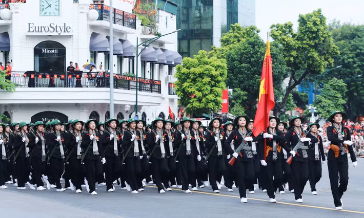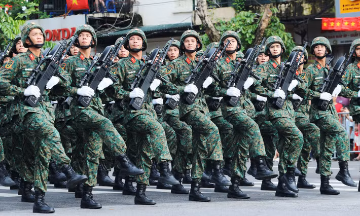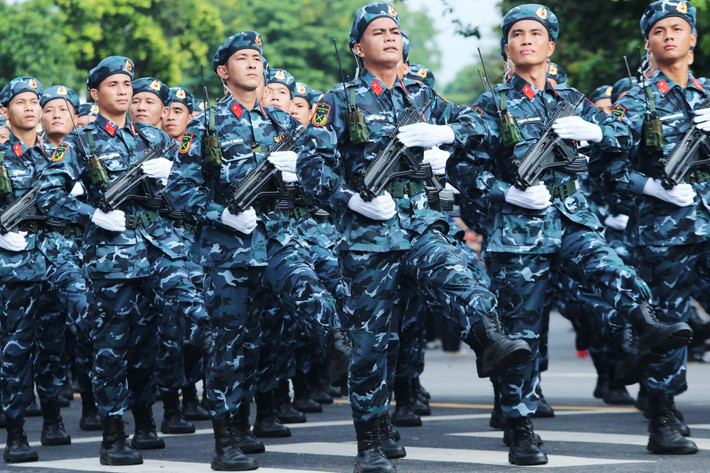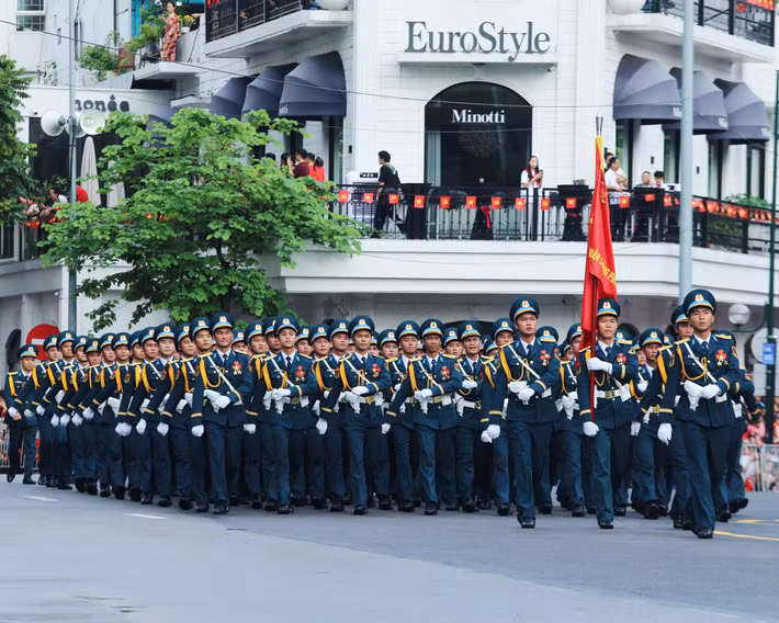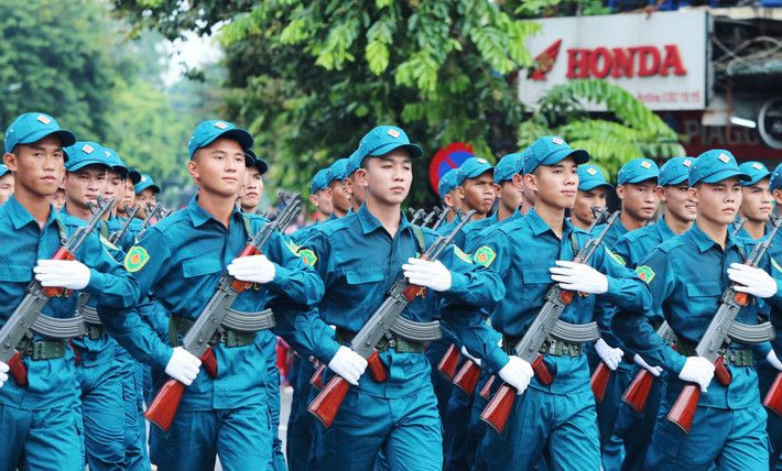Các khối tham gia diễu binh, diễu hành tạo nên một khung cảnh hào hùng với hàng lối, bước đi đều tăm tắp.
