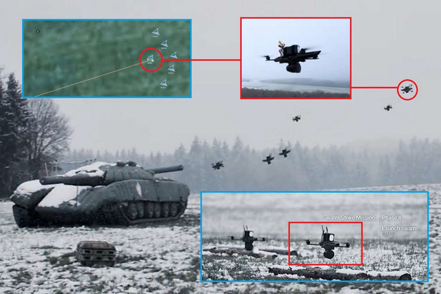 Cuộc thử nghiệm được tiến hành vào tháng trước kết hợp tám loại vũ khí lượn vòng tầm ngắn điều khiển từ góc nhìn người thứ nhất với hai máy bay không người lái cánh cố định tầm trung trong một đội hình phối hợp.