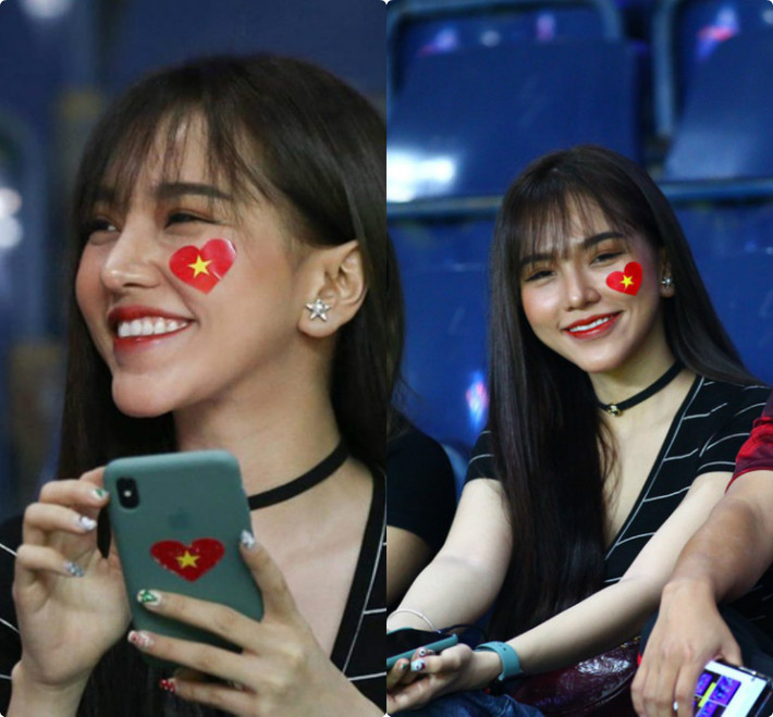 Sở hữu gương mặt xinh xắn, mũi cao cùng nước da trắng mịn, bạn gái Hoàng Đức thu hút mọi ánh nhìn. Gia Hân còn thể hiện tình yêu với bóng đá Việt Nam khi mặc áo cờ đỏ sao vàng nổi bật trên khán đài.