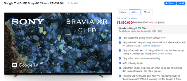 Ngoài ra, nhiều mẫu TV Sony còn có các chương trình khuyến mãi hấp dẫn trong tháng 5 này, giúp khách hàng tiết kiệm chi phí khi mua sắm. Thêm nữa, một số mẫu TV Sony mới sẽ đến với thị trường trong nước trong tháng này, khách hàng có thể đặt cọc trước để sở hữu chúng sớm nhất.