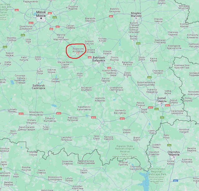 Thành phố Asipovichy (khoanh đỏ) nằm ở phía đông nam thủ đô Minsk và cách biên giới phía bắc của Ukraine khoảng 180km.