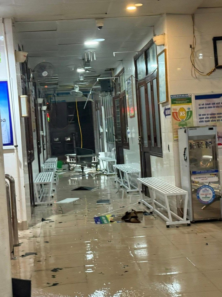 Trần nhà bị gió cuốn bay vương vãi khắp khuôn viên bệnh viện.
