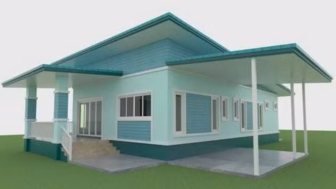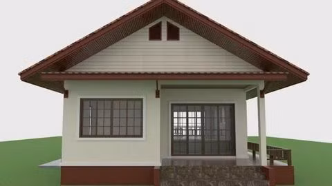 Một thiết kế nhà đẹp cấp 4 nhỏ gọn đa năng, phù hợp với mọi túi tiền của gia chủ. Thiết kế hiện đại pha lẫn nét cổ điển lãng mạn qua chi tiết trang trí cột, tường. Mái nhà dốc có bít đốc và rãnh (Hips and Valley roof) lợp ngói xanh hài hòa với thiết kế mặt tiền. Mặc dù mặt tiền mang lại cảm giác rất nhỏ nhắn, thực ra không gian nội thất khá rộng rãi với 3 phòng ngủ, 2 phòng tắm cùng bếp và phòng khách kết nối với tiền sảnh bên ngoài.