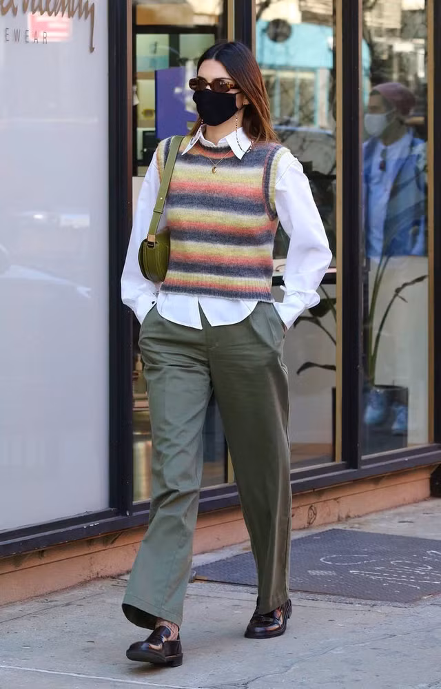 Kendall Jenner chính là nữ hoàng áo len khi nói đến tủ đồ mùa thu. Một chiếc áo vest len khoác ngoài áo sơ mi trắng hay áo phông cũng vừa đủ giữ ấm cho bạn mà không cần đến chiếc áo khoác dày và nặng nề. Với một chiếc áo phông bó sát, hãy mặc áo len oversized mô phỏng năng lượng của thập niên 80. Với một chiếc áo sơ mi cài cúc, hãy chọn chiếc áo vest len cắt nhỏ để tạo dáng cho bộ trang phục rộng baggy. Chọn một màu sắc đầy màu sắc và có phong cách vui nhộn.