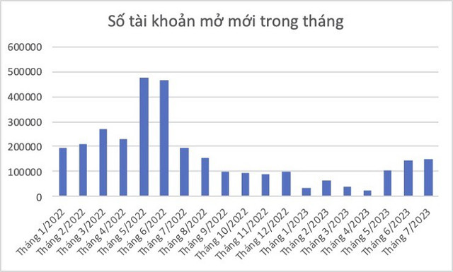Cũng theo VDS, tháng 7 vừa qua là tháng thứ 3 liên tiếp thị trường đón nhận số tài khoản mở mới cao hơn tháng liền trước và vượt trên con số trăm nghìn đơn vị. Số lượng tài khoản mở mới trong tháng 7 đạt mức cao nhất kể từ tháng 9.2022, nhưng vẫn thấp hơn nhiều giai đoạn tháng 5 - tháng 6.2022, khi có tới trên 400.000 tài khoản mở mới mỗi tháng.