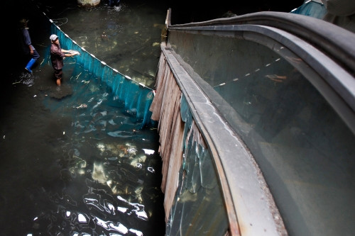 Để hạn chế muỗi, những người sống gần các trung tâm mua sắm thả cá vào bể nước và theo thời gian số lượng cá trong bể phát triển nhanh chóng. Theo ước tính có khoảng 3.000 con cá, chủ yếu là cá chép, cá trê, cá rô phi. Bể cá này cứ tồn tại như vậy song rất ít người biết đến. Chỉ từ tháng 6/2014, những bức vẽ về hồ cá khổng lồ này được chia sẻ nhiều trên các trang mạng xã hội, mọi người mới bắt đầu chú ý.