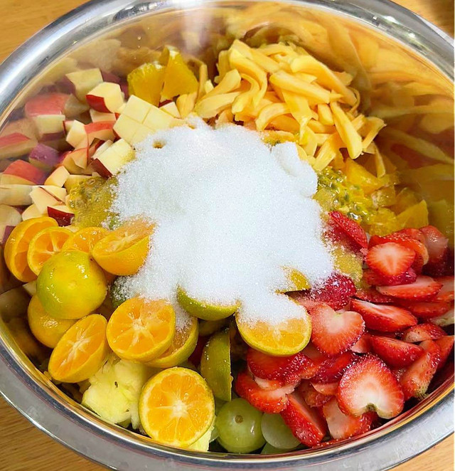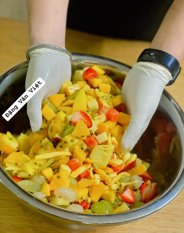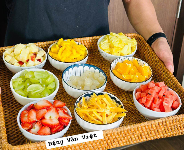 Các loại trái cây thái nhỏ vừa ăn. Có thể thay đổi các loại trái cây tùy theo sở thích cá nhân. Không nên dùng những loại quả nặng mùi như sầu riêng.