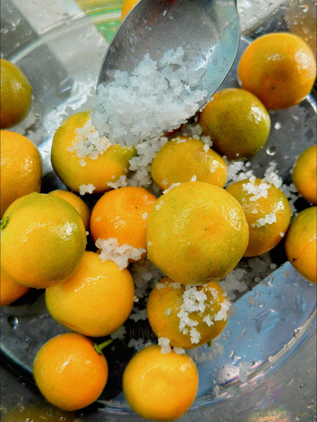 Quất rửa sạch, cho thêm muối vào rửa kỹ để loại bỏ bớt mùi hăng và đắng của vỏ.