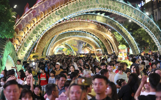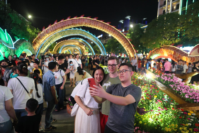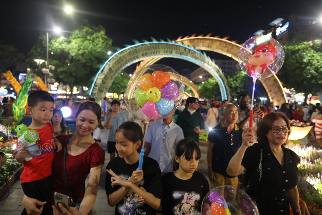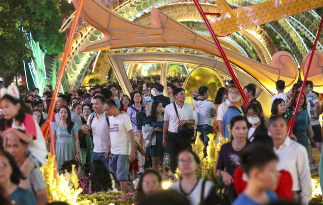 Tối 7/2 (28 tháng Chạp), đường hoa Nguyễn Huệ Tết Giáp Thìn với chủ đề “Xuân yêu thương, Tết sum vầy”chính thức khai mạc, đông nghẹt người dân vào tham quan, vui chơi.