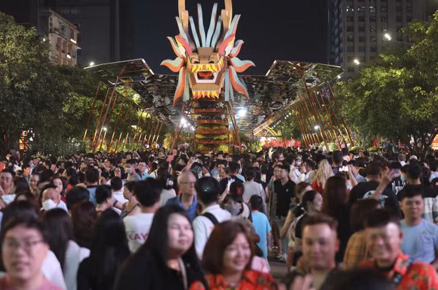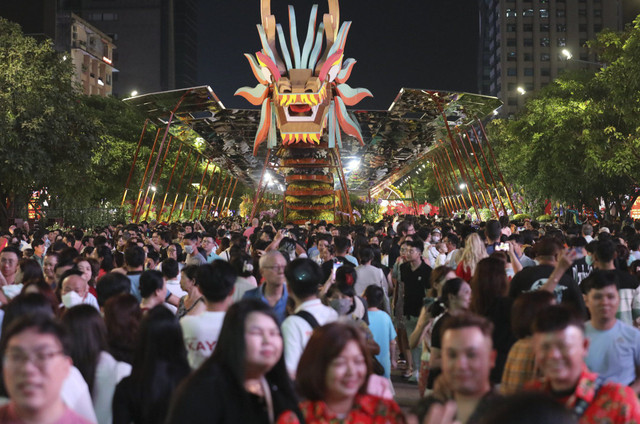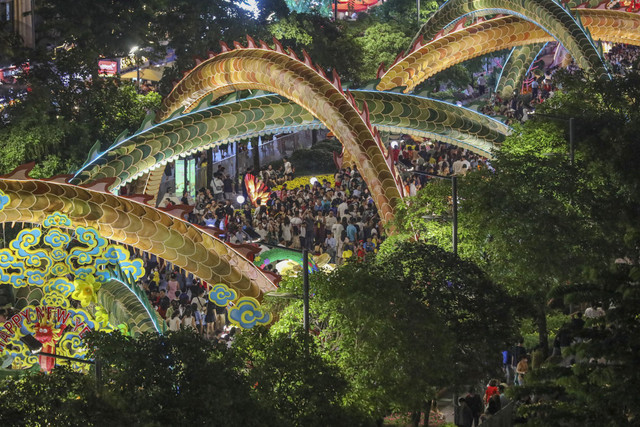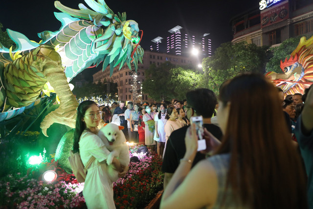 Tại khu vực đường hoa giao với đường Tôn Đức Thắng, linh vật rồng uốn lượn dài hàng trăm mét, thuyền rồng hai đầu ở hai hướng là những đại cảnh thu hút du khách tham quan, chụp hình.