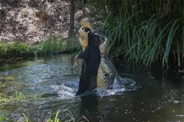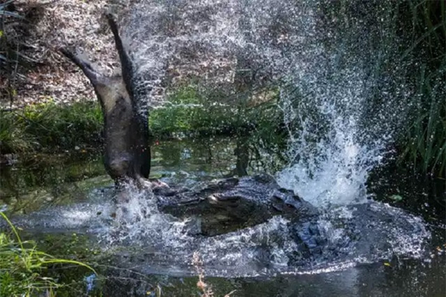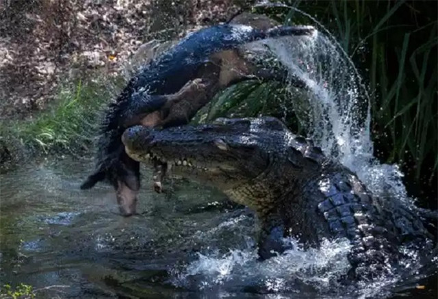 Trong bức ảnh, con cá sấu khổng lồ quăng con lợn rừng nhỏ con lên không trung, trước khi xé nhỏ con mồi một cách tàn nhẫn rồi ăn nó.