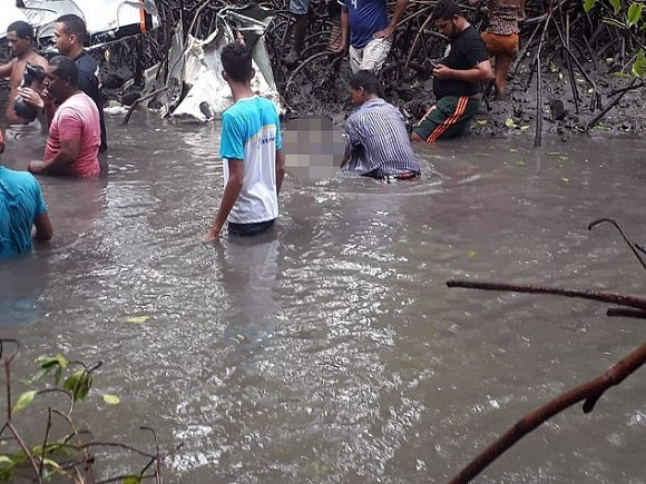 Trong hình là bức ảnh hiện trường vụ tai nạn, xác chiếc máy bay nằm rải rác thành từng mảnh trên sông, lực lượng cứu hộ được huy động đến để kéo các thi thể khỏi mặt nước.