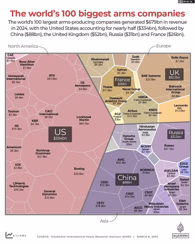 Năm 2024, 100 công ty quốc phòng hàng đầu thế giới đạt doanh thu hơn 679 tỷ USD, theo Viện Nghiên cứu Hòa bình Quốc tế Stockholm (SIPRI).