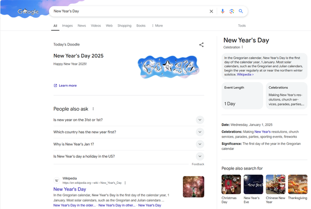 Khi nhấn vào hình ảnh này, người dùng sẽ được dẫn tới kết quả tìm kiếm cho từ khóa "New Year's Day". Trên máy tính của người viết, kết quả đầu tiên đến từ bách khoa toàn thư Wikipedia giải nghĩa những điều xoay quanh chủ đề "New Year's Day".