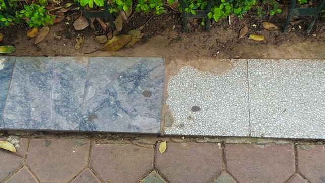 | Dù chi hàng tỷ đồng nhưng hiện vỉa hè, đường dạo quanh Hồ Gươm có hơn 20 loại gạch đá khác nhau và thiếu đồng bộ như "chiếc áo vá". |