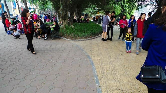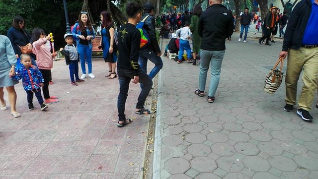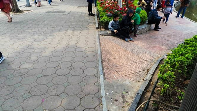 | Vỉa hè phía ngoài Hồ Gươm sát đường Đinh Tiên Hoàng được lát bằng gạch block cũ. |
