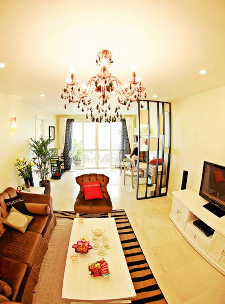 Căn hộ khá rộng rãi, có thiết kế đơn giản, phòng khách sát với ban công lớn nên rất sáng..