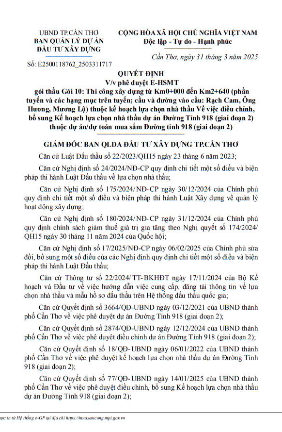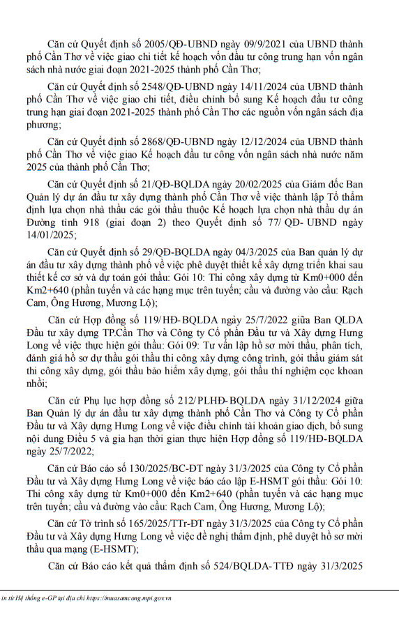 Ngày 31/03/2025, Ban Quản lý dự án Đầu tư xây dựng thành phố Cần Thơ đã phê duyệt E-HSMT gói thầu số 10 theo quyết định số E2500118762_2503311717. Gói thầu được Công ty Cổ phần Đầu tư và xây dựng Hưng Long mời thầu theo hình thức đấu thầu rộng rãi, phương thức lựa chọn là một giai đoạn một túi hồ sơ, nguồn vốn thực hiện từ ngân sách Trung ương và ngân sách địa phương, thời gian thực hiện gói thầu trong 9 tháng theo hợp đồng đơn giá cố định, dự kiến mở thầu vào ngày 18/4/2025.