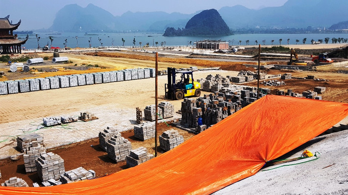 Nguyên vật liệu, xi măng được tập kết xung quanh điện Quan Âm.