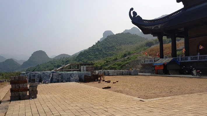 Nhìn từ trên điện Quan Âm xuống chỗ nào cũng tràn ngập vật liệu xây dựng.