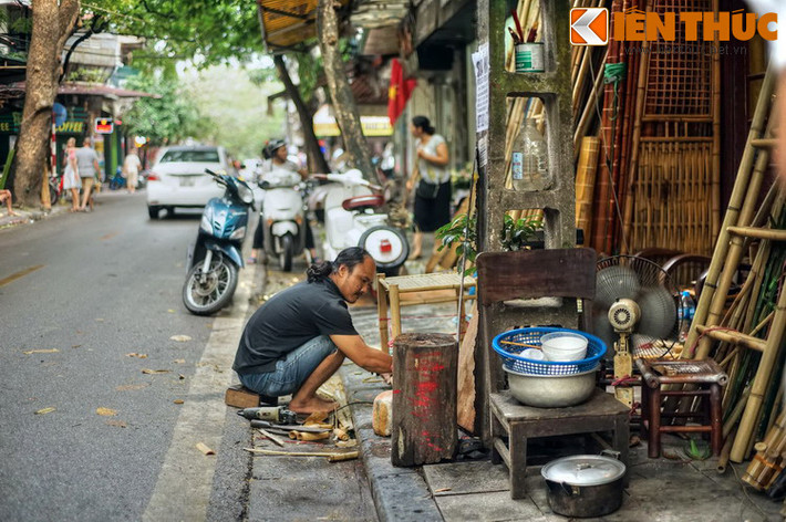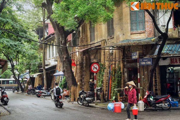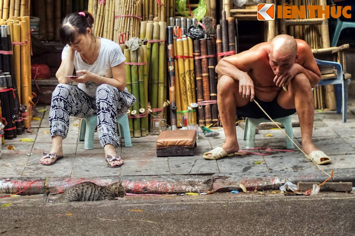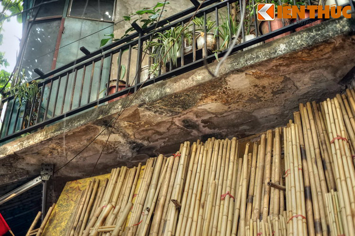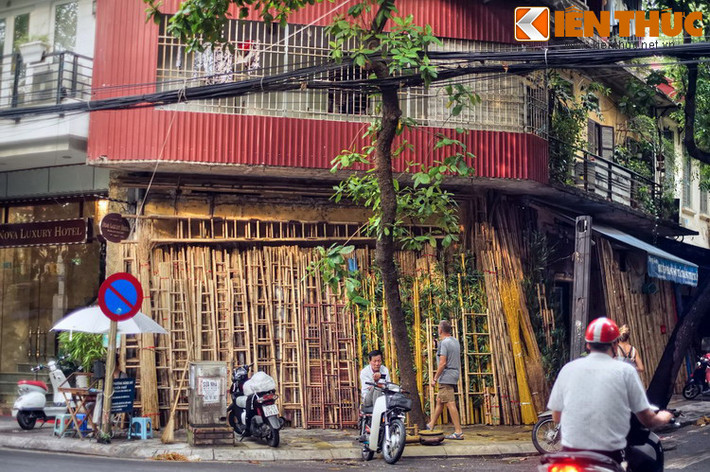Những chiếc sào tre, thang tre cao vút được bày kín vỉa hè, che khuất cả tường nhà đã tạo nên khung cảnh “độc nhất vô nhị” cho phố Hàng Vải.