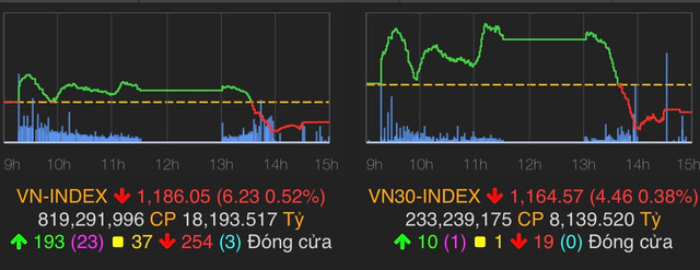 VN-Index giảm 6,23 điểm (0,52%) xuống 1.186,05 điểm