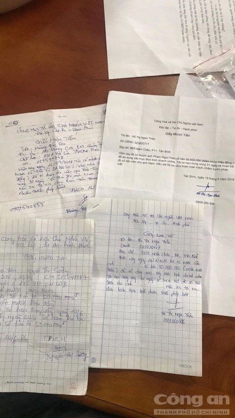 | Hồ sơ, giấy tờ thể hiện sự vay nợ của nhiều "con mồi" |