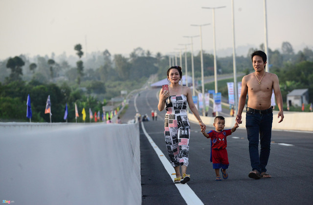 "Nhà bố mẹ bên cầu nhưng lâu lâu mới về thăm, nhân dịp cầu khánh thành mình đưa vợ con lên dạo mát, chiêm ngưỡng cây cầy và ngắm cảnh quê hương từ trên cao mà bấy lâu nay không có dịp. Cây cầu rất đẹp, chúng tôi rất tự hào với công trình hiện đại và ý nghĩa này", anh Phan Văn Giàu, ngụ quận Thủ Đức, TP.HCM, cho hay.