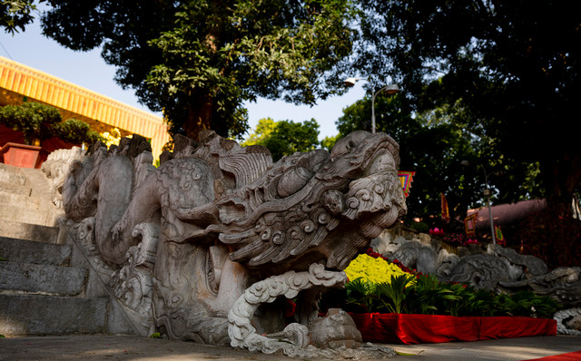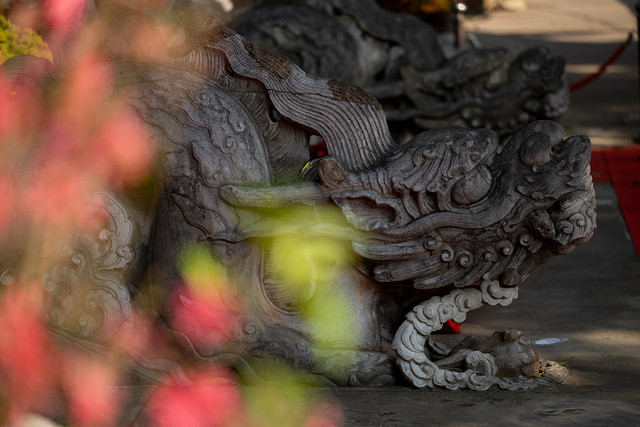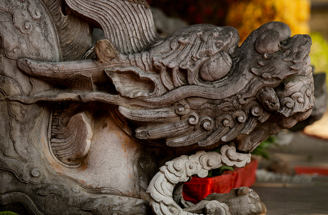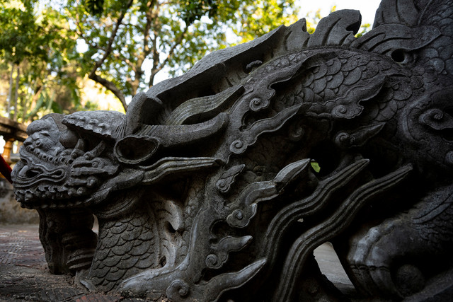 Đầu rồng nổi bật với những nét chạm tinh xảo, thể hiện được sự oai hùng, mạnh mẽ.