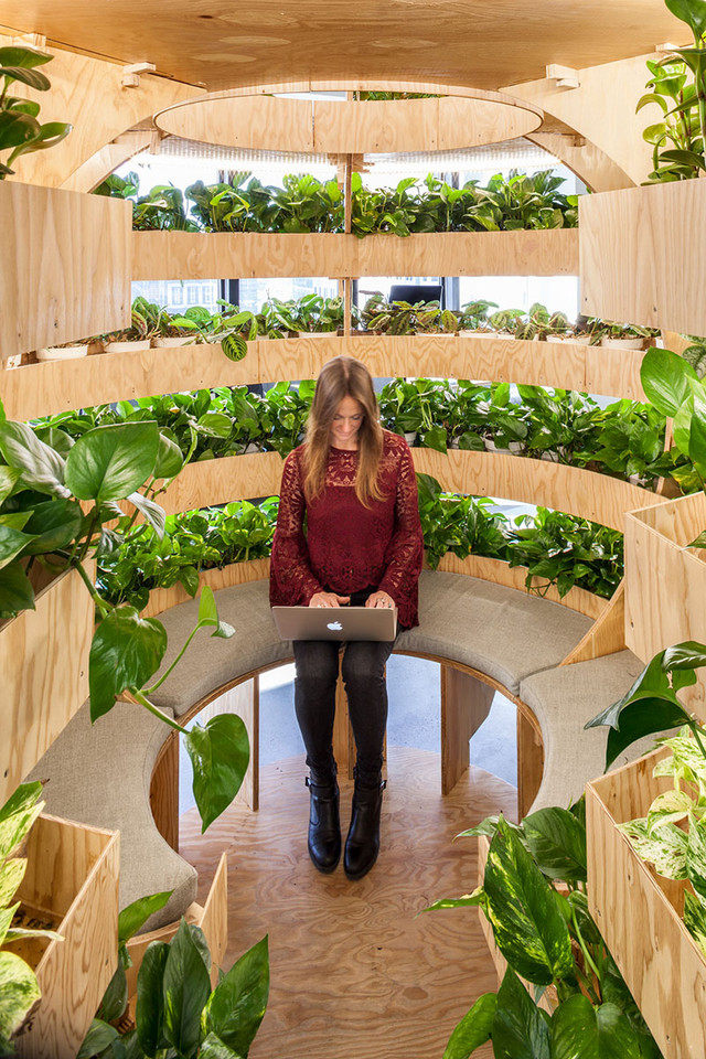 Văn phòng cũng có những góc riêng để họp. Những bức tường xanh bên cạnh mang thêm thiên nhiên đến với văn phòng.