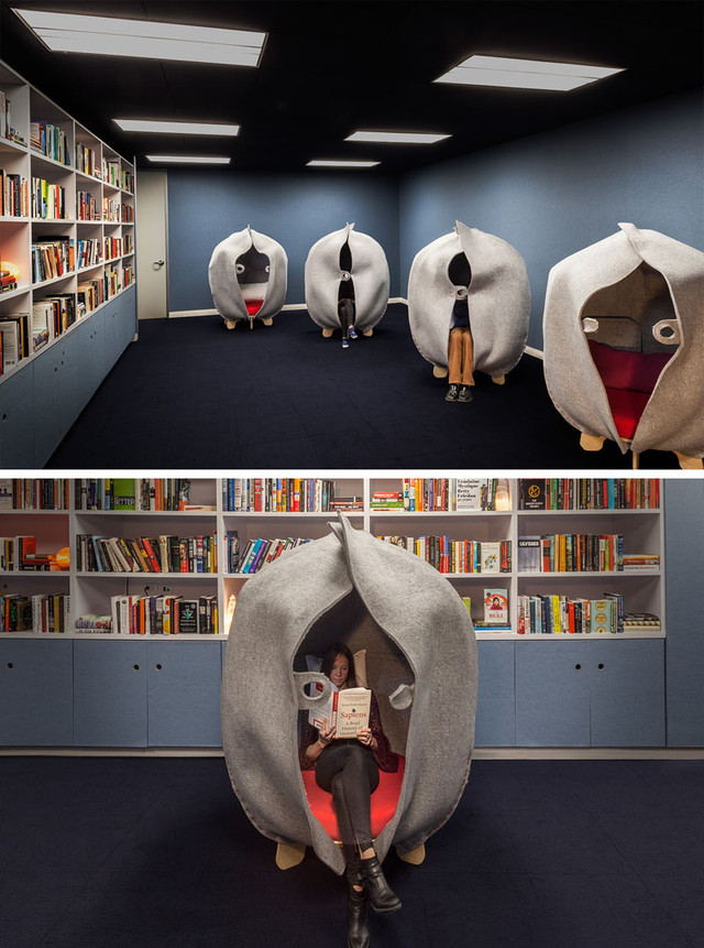 Căn phòng này vừa là một thư viện vừa là phòng thiền, sử dụng những "cái kén" độc đáo của hãng HUSH, giúp nhân viên có thể "đi trốn" khi tâm trạng không tốt và không muốn tiếp xúc với ai.