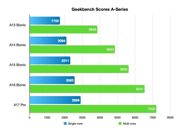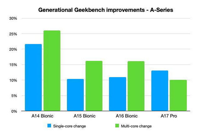 Trong những năm tiếp theo, mức tăng đã được hạn chế hơn, ở mức từ 10 - 16% mỗi năm. Đối với A17 Pro, mức nâng cấp lần lượt là 13% và 10% cho thử nghiệm lõi đơn và đa lõi.