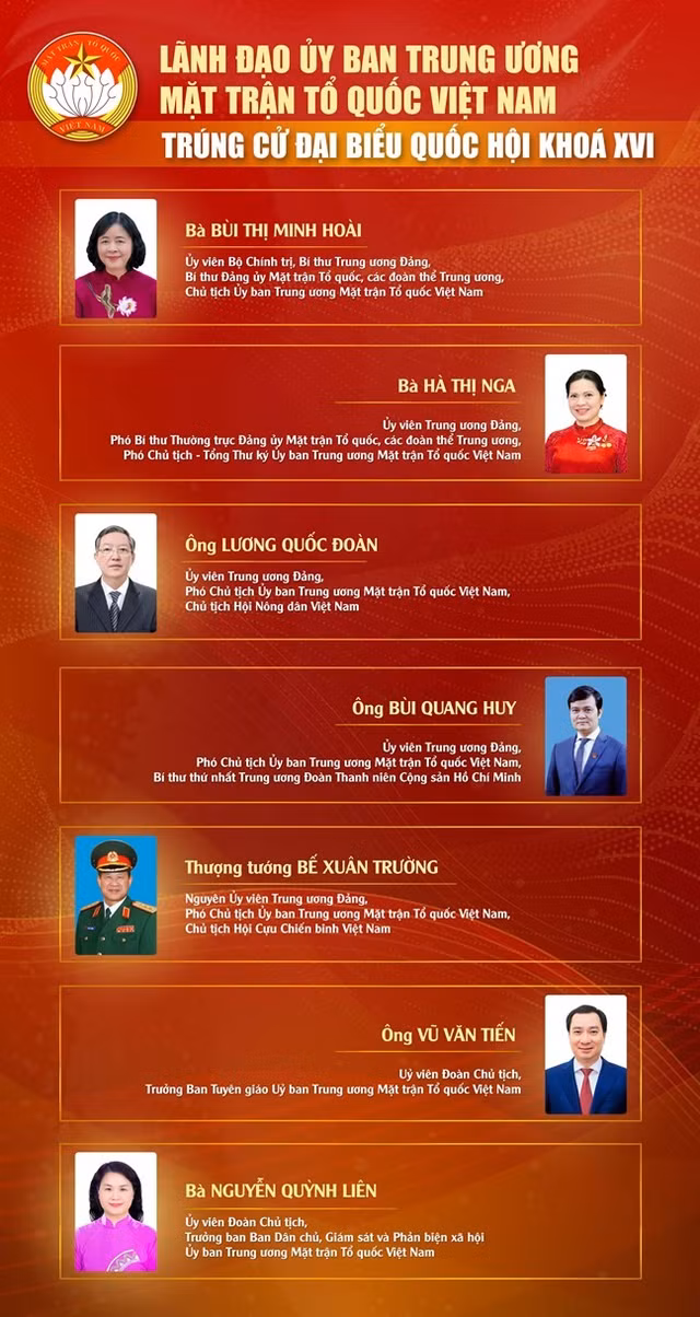 Theo danh sách công bố, Ủy viên Bộ Chính trị, Bí thư Trung ương Đảng, Chủ tịch Ủy ban Trung ương MTTQ Việt Nam Bùi Thị Minh Hoài; Ủy viên Trung ương Đảng, Phó Chủ tịch – Tổng Thư ký Ủy ban Trung ương MTTQ Việt Nam Hà Thị Nga cùng 5 vị Ủy viên Đoàn Chủ tịch Ủy ban Trung ương MTTQ Việt Nam trúng cử đại biểu Quốc hội khoá XVI.