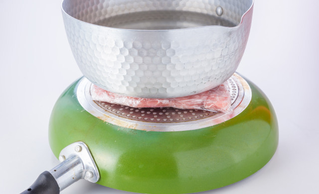 Đây là phương pháp rã đông sử dụng tính dẫn nhiệt của nhôm. Đặt miếng thịt trên đáy chảo, đổ nước ẩm 30 – 35 độ C lên nồi nhôm đặt bên trên. Nếu là thịt vụn hoặc thịt đã thái móng, có độ dày 1cm trở xuống có thể áp dụng cách rã đông này, tốn khoảng 4 – 5 phút.