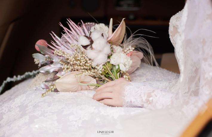 Ngày 28/3, đám cưới Quang Hải - Chu Thanh Huyền diễn ra tại tư gia hai bên ở Đông Anh và Sơn Tây. Trong lễ rước dâu, Chu Thanh Huyền chọn thiết kế của NTK Trà Linh. Ảnh: Lê Chí Linh.