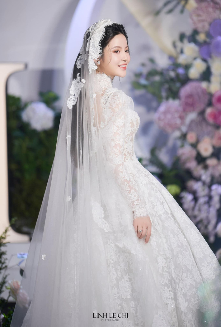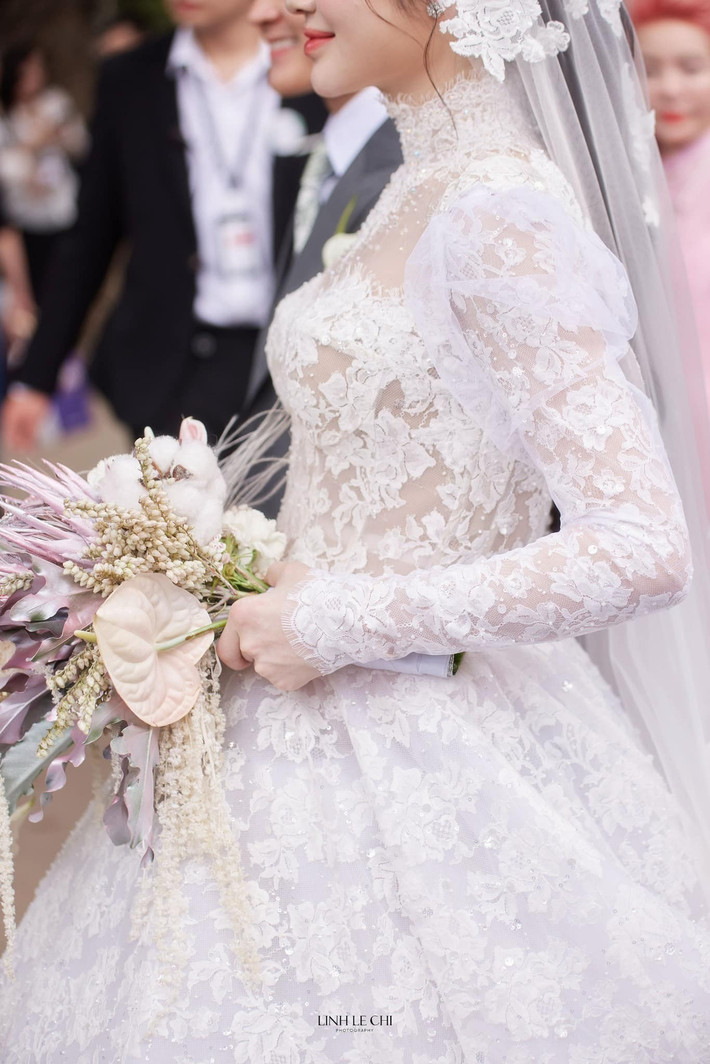 Bộ váy có nhiều nét tương đồng với mẫu thiết kế mà Chu Thanh Huyền mặc khi lên xe hoa. Thiết kế có điểm nhấn với vai bồng, tay dài, cổ cao đính kết cầu kỳ. Ảnh: Lê Chí Linh.