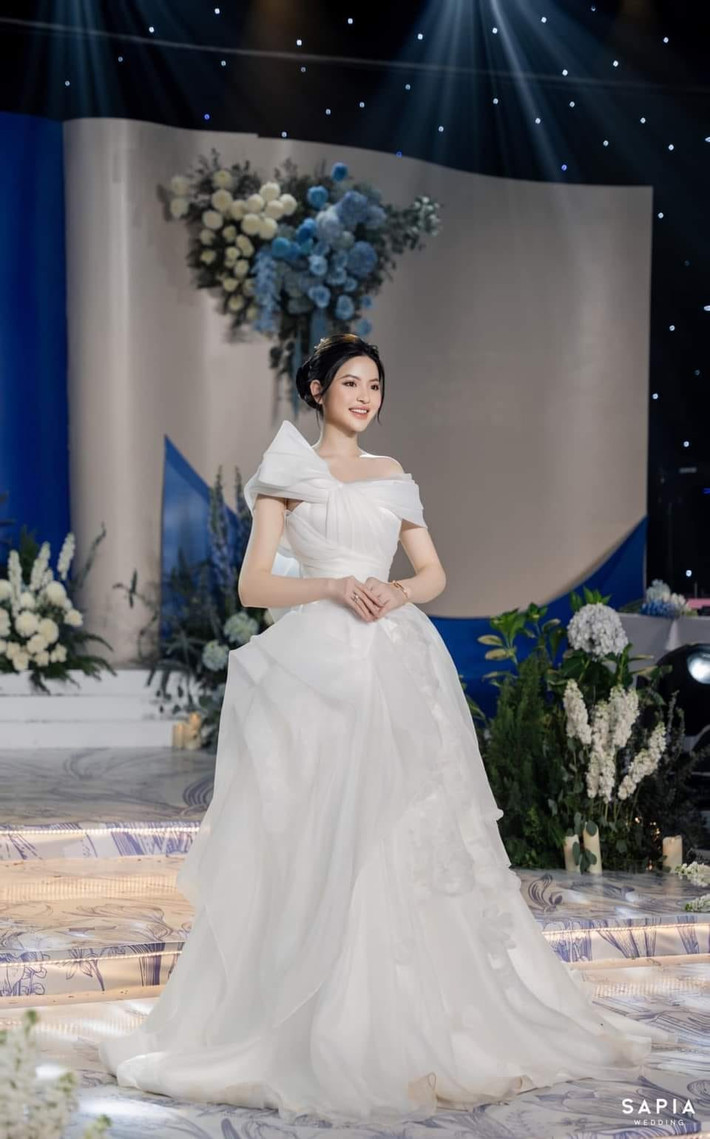 Mẫu váy thứ hai được Chu Thanh Huyền lựa chọn khi đón khách tại nhà trai khá đơn giản, nhẹ nhàng. Ảnh: Lê Chí Linh.