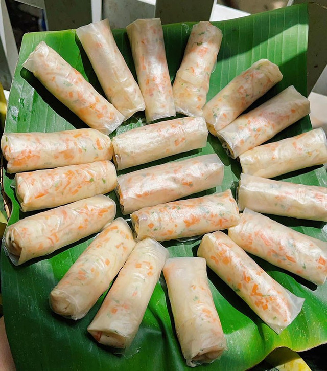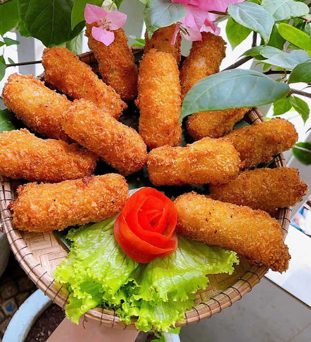 Khi chiên để lửa vừa, vì bột chiên xù và trứng dễ bị cháy. Thành phẩm là những cuốn chả giò ngoài giòn tụm, bên trong béo ngậy chảy sốt.