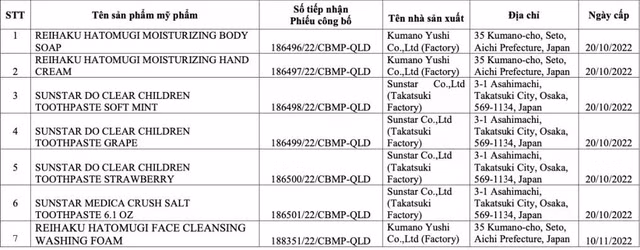 Danh mục 7 sản phẩm bị thu hồi và tiêu hủy đợt này bao gồm các mặt hàng chăm sóc cá nhân thiết yếu như sữa tắm, kem dưỡng da tay, kem đánh răng và sữa rửa mặt mang thương hiệu ReiHaku Hatomugi và Sunstar, các sản phẩm này đều có xuất xứ từ Nhật Bản.