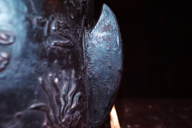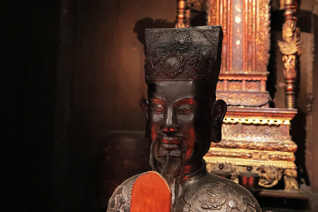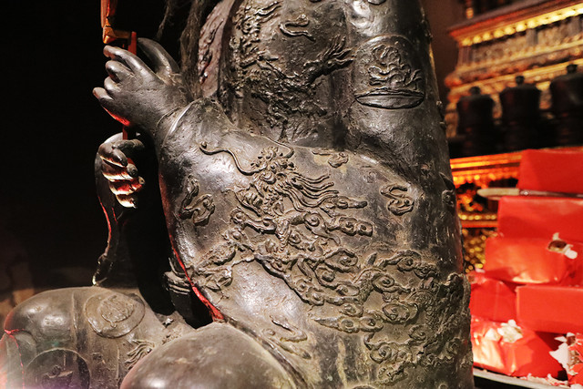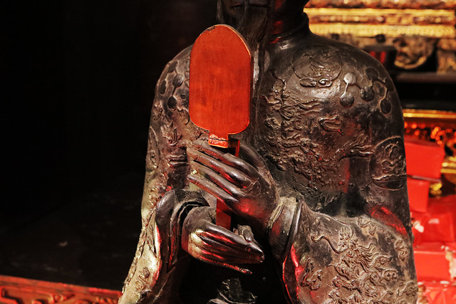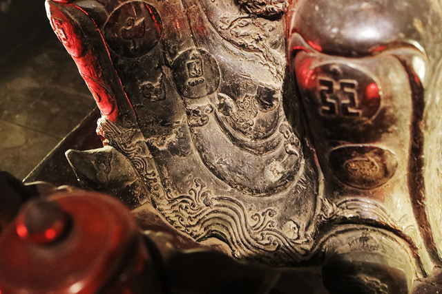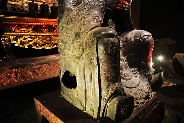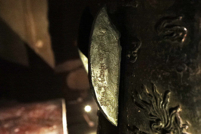Các dòng chữ Hán được khắc và dát vàng ở hai “lưỡi xén” sau lưng pho tượng.