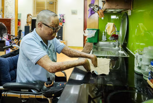 Khi rảnh rỗi, anh tự mình đi xe lăn xuống sân chung cư hóng gió buổi chiều, hay ngồi uống nước chè, chuyện phiếm với bảo vệ đến khuya.