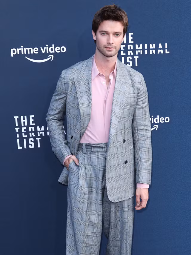 GhimPatrick Schwarzenegger gây ấn tượng mạnh mẽ trong bộ vest kẻ ca-rô hai dây cùng áo sơ mi hồng.